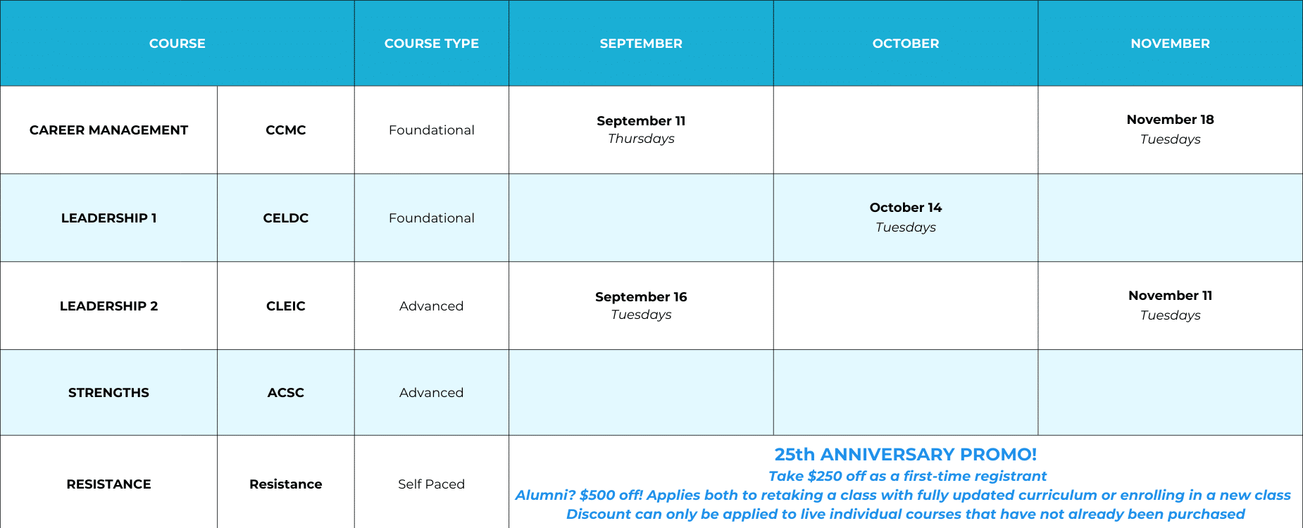 Using the links below, scroll down this page to see more details about each of our our upcoming ICF & SHRM approved coaching courses and register to save your spot!